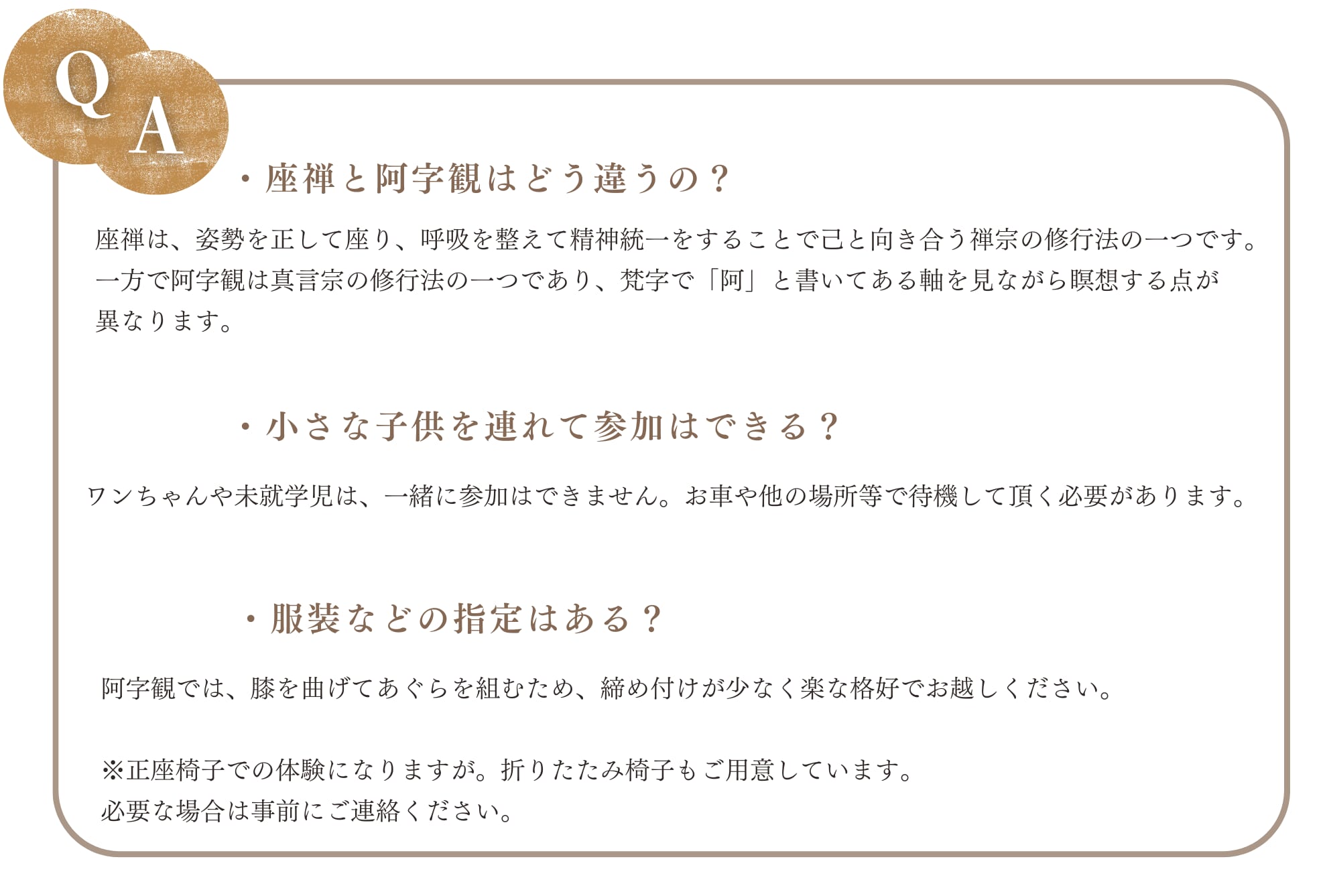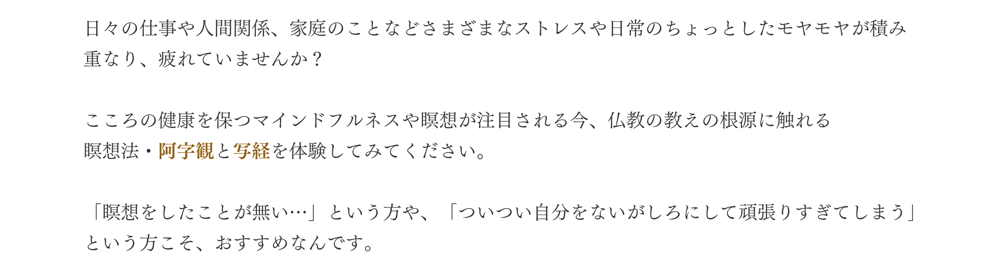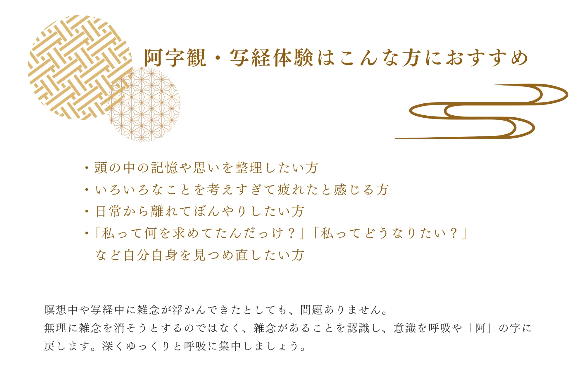 所要時間:90分(阿字観→御写経→説明付き本堂見学)